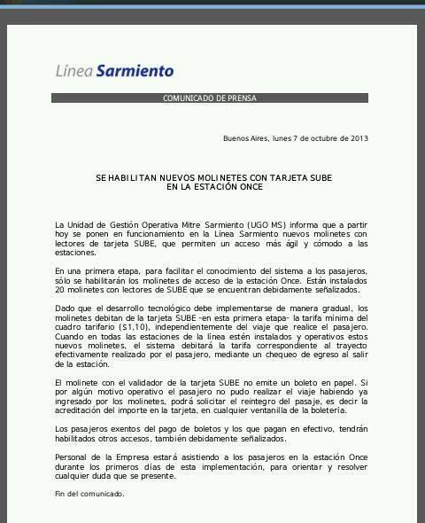 Comunicado de prensa de UGOMS por la implementacion del Sistema la Tarjeta SUBE en la Estación Once